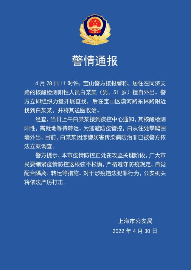 记者从上海市公安局了解到,4月28日11时许,上海宝山警方接报警称,居住在同济支路的核酸检测阳性人员白某某(男,51岁)擅自外出。警方立即组织力量开展查找,后在宝山区漠河路东林路附近找到白某某,并将其送医收治。