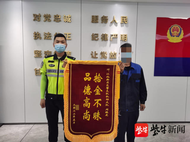刘先生放下电话赶到后,从队员手上接过“失而复得”的钱包,终于松了口气,连连说着感谢。为此,在5月16日上午,刘先生特意送上一面写着“拾金不昧,品德高尚”的锦旗,感谢周振龙的帮助。