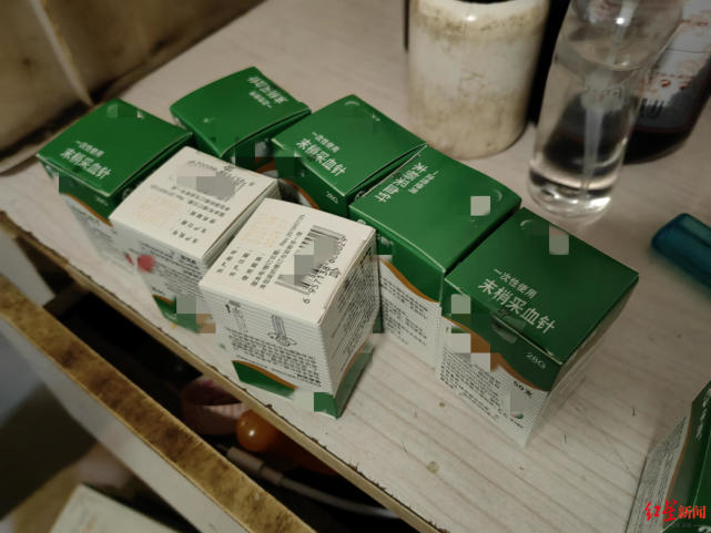 再往里面的房间观察,执法人员在一张桌子上发现多盒写有“一次性使用末梢采血针”的器械。打开一看,发现其中包装有可侵入式使用的针具。