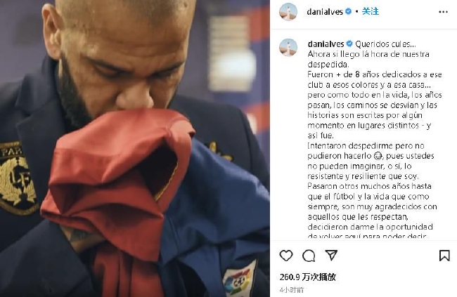 虽然巴萨的此番决定看起来有些不近人情,但阿尔维斯并未有太多负面的情绪,在得知这一消息之后,巴西老将第一时间发文说出了自己的感想:“现在是我们说再见的时候了。这是献给这家俱乐部、这些颜色和这个家的8年,但就像生活中的一切,岁月流逝,道路分岔,故事在不同的地方书写不同的时刻,事实就是如此。足球和生活一如既往地感激那些尊重他们的人,很多年之后,他们决定给我机会回到这里,以便我可以说再见。对他们所有人,我要说谢谢。我还要感谢所有的工作人员,他们给了我回到这个俱乐部的机会,让我能够再次穿上这件美妙的球衣,你们不知道我有多幸福,我希望他们不会想念我的疯狂和我的日常幸福。一个美丽的周期结束了,另一个更具挑战性的周期开始了。愿世界永远不会忘记:一只狮子即使在39岁时仍然是一只疯狂的好狮子。巴萨万岁!”