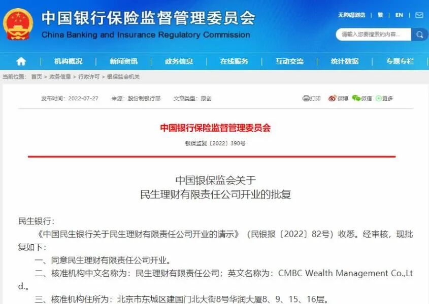 7月27日,银保监会网站发布《关于民生理财有限责任公司开业的批复》,同意民生理财有限责任公司(以下简称“民生理财”)开业,批复日期为6月15日。