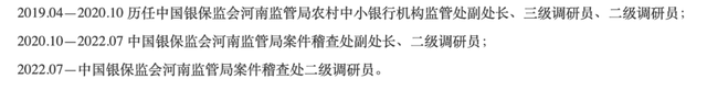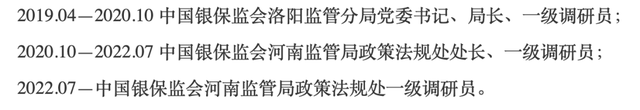 简历显示,2022年7月,他不再担任河南监管局政策法规处处长职务。