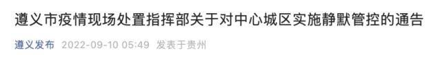 9月10日,遵义市决定对中心城区(红花岗区、汇川区、新蒲新区、播州区)实施静默管控。
