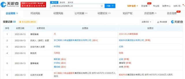 上海云钜创业投资有限公司成立于2013年12月,注册资本约145.71亿人民币,经营范围包括实业投资,资产管理,投资咨询,企业管理咨询等。股东信息显示,该公司由蚂蚁科技集团股份有限公司全资持股。