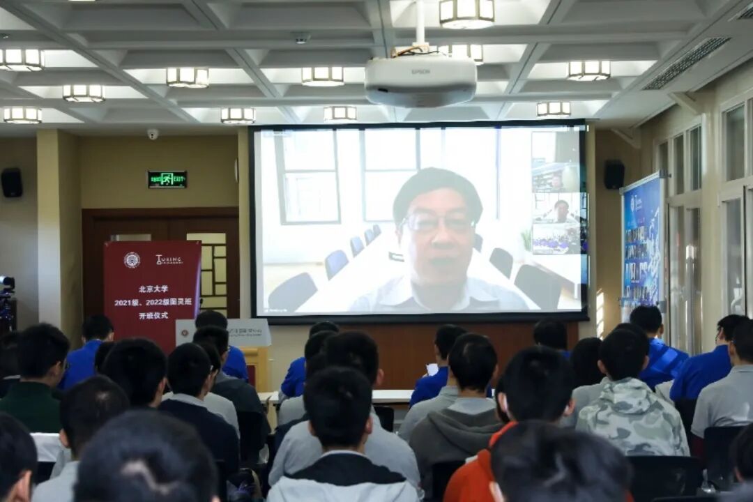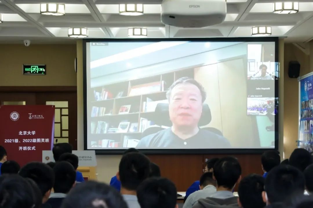北京大学访问讲席教授、前沿计算研究中心主任、图灵班指导委员会主任约翰·霍普克罗夫特(John Hopcroft)教授通过视频欢迎同学们来到北京大学图灵班。他通过自己的三位获图灵奖学生的经历鼓励同学们“寻找并专注于自己所爱”,并表示,大学教育不仅在课堂上,更多在课堂以外,希望同学们在图灵班培养思辨能力和开放性思维,在与老师和同学们的互动交流中开拓视野,并期待尽快回到北大,在课堂上与大家面对面交流。