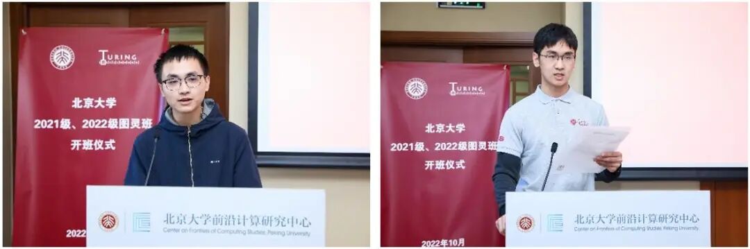两位图灵班新生代表分享了他们入选图灵班的憧憬与喜悦。2022级的张记僖同学期待和大家乘风破浪、努力奋进,用自己所学知识建设祖国。2021级的蒋轩林同学感谢图灵班这样一个跨越年级、代代传承的集体,希望未来也能够为学弟学妹答疑解惑,为图灵班的建设贡献自己的一份力量。