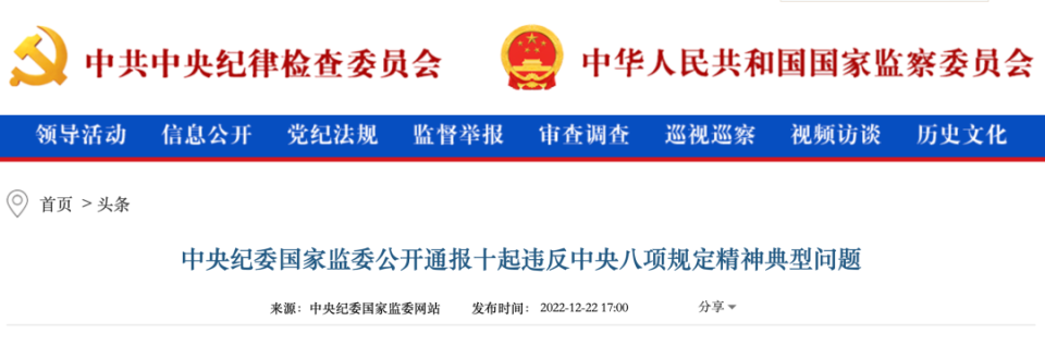 12月22日,中央纪委国家监委公开通报10起违反中央八项规定精神典型问题。