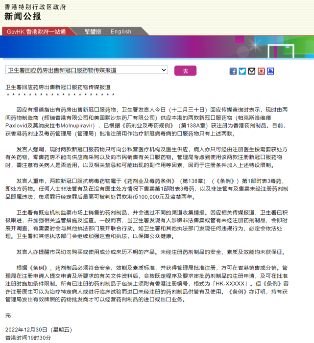 据香港特区政府新闻公报,因应有报道指出有药房出售新冠口服药物,香港卫生署发言人今日(12月30日)回应表示,现时由两间药物制造商(辉瑞香港有限公司和美国默沙东药厂有限公司)供应本港的两款新冠口服药物(帕克斯洛维德Paxlovid及莫纳皮拉韦Molnupiravir),已根据《药剂业及毒药规例》(第138A章)获注册为香港药剂制品。目前,获香港药剂业及毒药管理局(管理局)批准注册用作治疗新冠病毒病的口服药物只有上述两款。