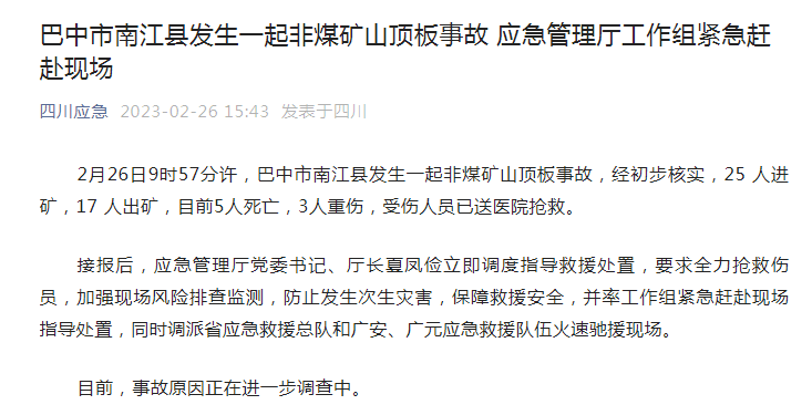 2月26日9时57分许,巴中市南江县发生一起非煤矿山顶板事故,经初步核实,25 人进矿,17 人出矿,目前5人死亡,3人重伤,受伤人员已送医院抢救。