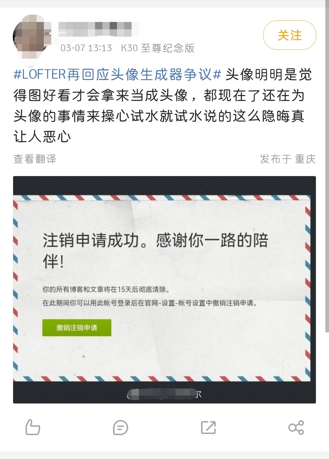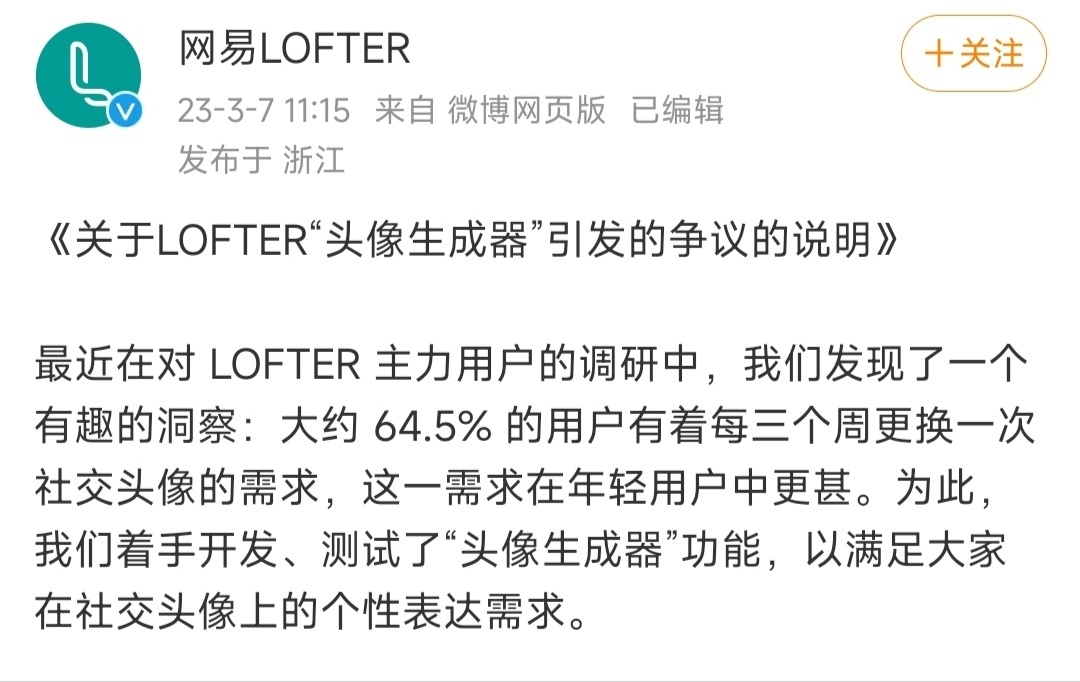 3月7日中午,LOFTER再度作出回应,再度说明了这一功能的开发初衷:“最近在对 LOFTER 主力用户的调研中,我们发现了一个有趣的洞察:大约 64.5% 的用户有着每三周更换一次社交头像的需求,这一需求在年轻用户中更甚。为此着手开发、测试了“头像生成器”功能,以满足在社交头像上的个性表达需求。”官方还表示这一功能的开发并没有其他目的,更无盈利目的,由此引发的舆论讨论“始料未及”,针对用户们的反馈建议,决定将“头像生成器”功能测试入口调整到“头像框中心”,生成图片仅可作为平台头像使用,不提供下载和发布功能,以尽可能规范功能使用场景。同时,LOFTER就AI绘画内容增加了更多的管理细则,针对“AI内容冒充原创”等用户关注的焦点问题公开了管理办法。