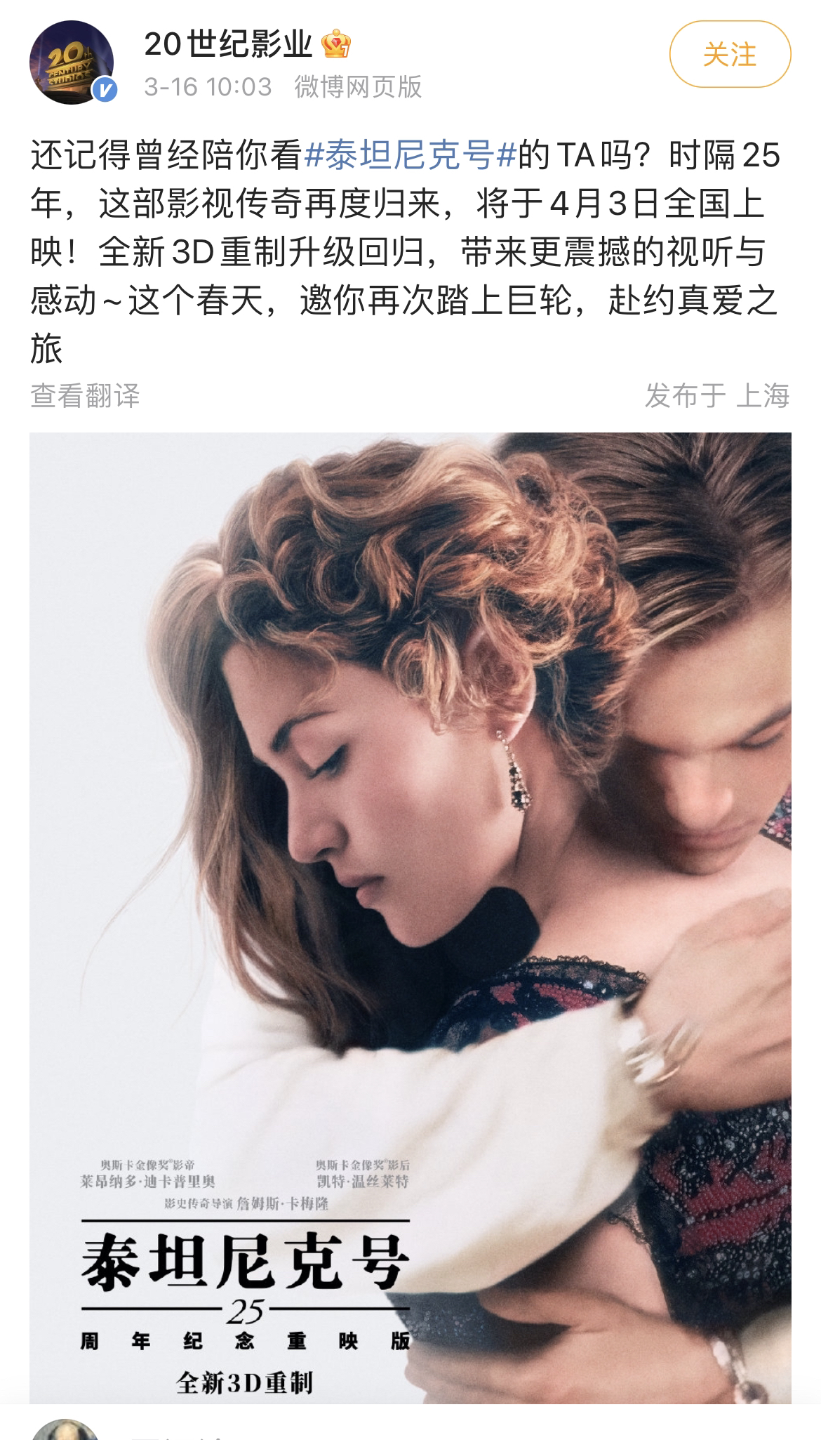 @20世纪影业今天上午发文称:还记得曾经陪你看#泰坦尼克号#的TA吗?时隔25年,这部影视传奇再度归来,将于4月3日全国上映!全新3D重制升级回归,带来更震撼的视听与感动~这个春天,邀你再次踏上巨轮,赴约真爱之旅。
