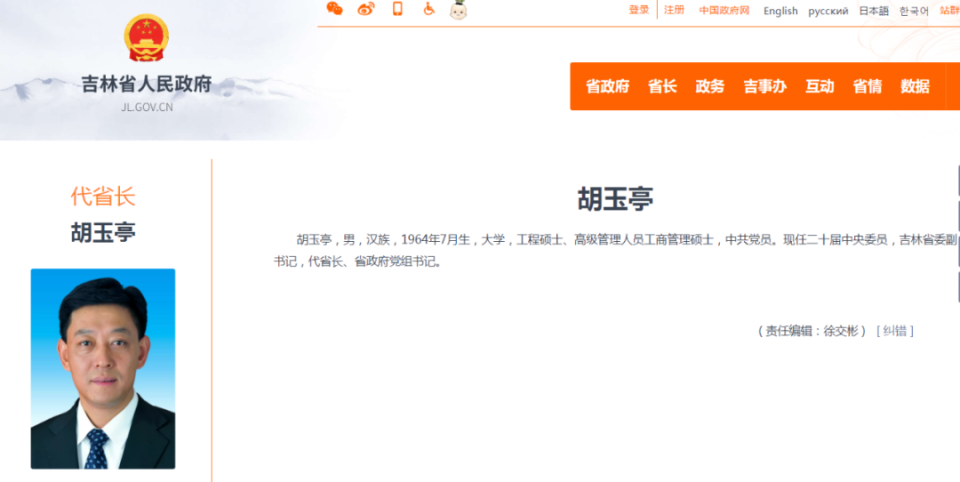 今年4月1日,胡玉亭再度跨省履职,担任吉林省委副书记、代省长、省政府党组书记。