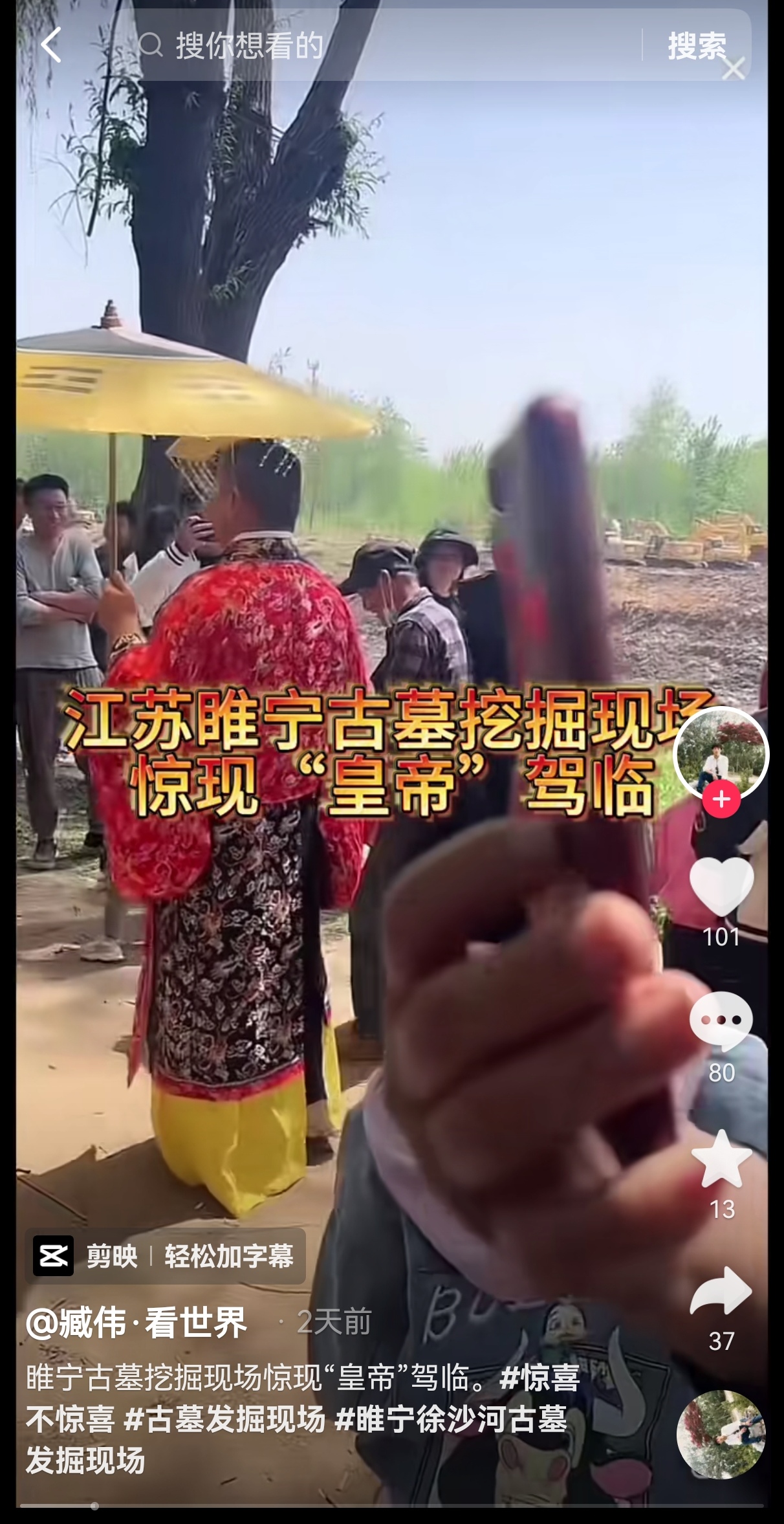 在短视频平台上可见各种现场直播,各地网红齐聚,以“究竟是谁的墓”吊足网友胃口。“睢宁挖出了古墓,我已到现场,正在直播中……”还有主播以“小县城两块青砖疑似挖出汉代墓群,千里之外到睢宁直播挖掘现场”这样的标题吸引流量。围观网友中也有睢宁人评论称,“我睢宁人,离现场只有十分钟我都懒得去,清理河道而已,居然被传成这样。”