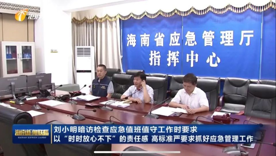 据当地媒体报道,刘小明到了海南省应急管理厅指挥中心,视频连线海口、三亚、五指山等市县应急管理局值班室,并电话连线省旅文厅、省交通运输厅、省卫健委、省气象局等单位值班室,详细了解值班人员在岗、交通运输、旅游秩序、气象预报、疫情防控等工作。