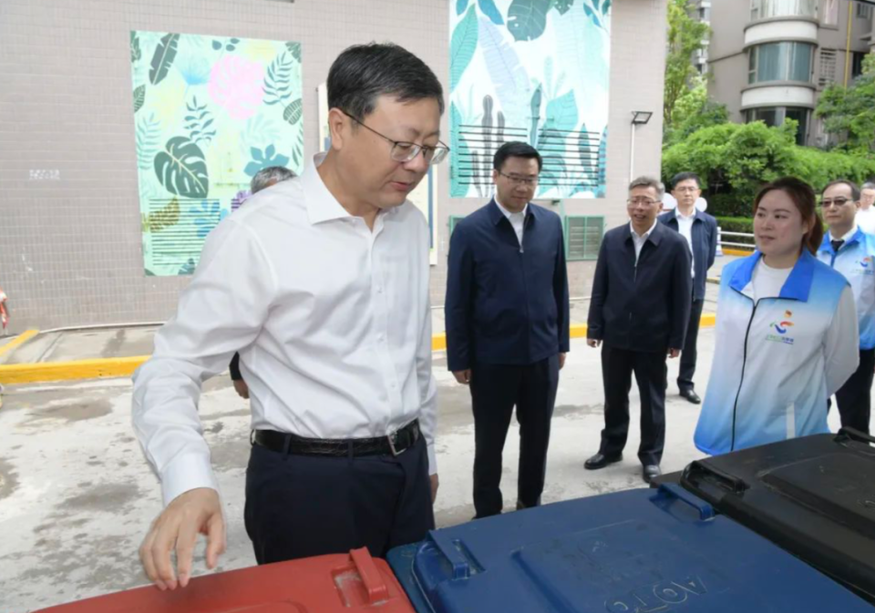 陈吉宁在虹口区嘉兴路街道爱家豪庭小区实地了解生活垃圾分类推进情况,在小区垃圾投放点和智能回收站,与志愿者交流,询问投放时间、分类引导及居民参与等情况。