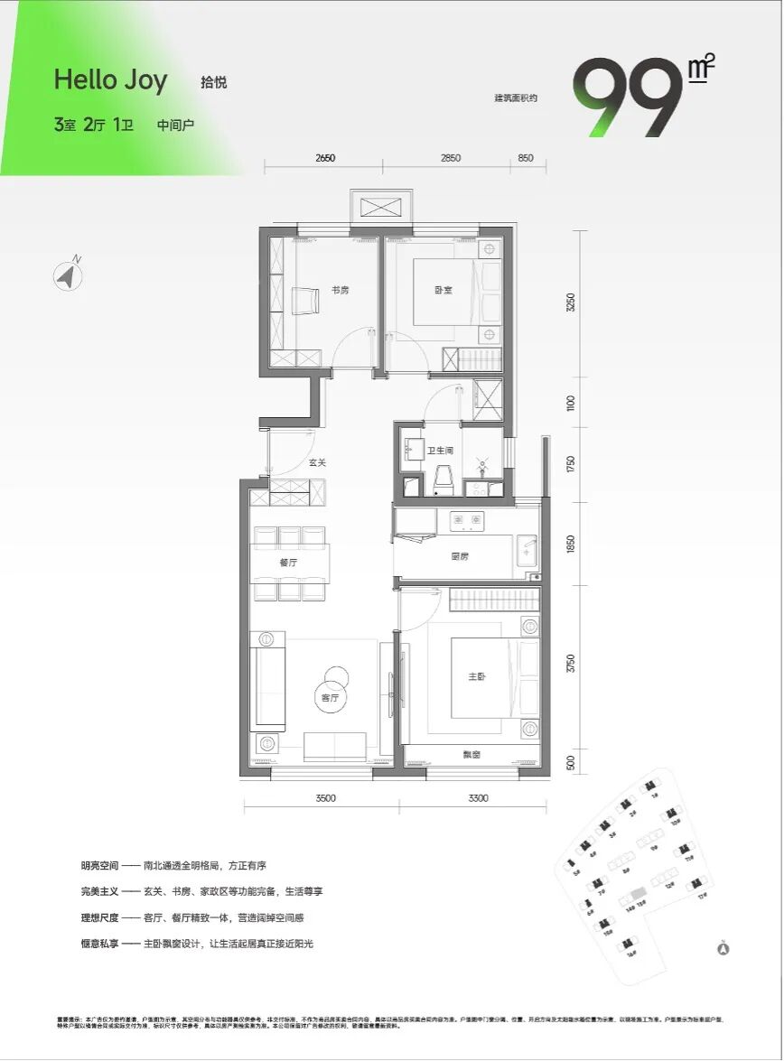 99平米功能性三居,南北通透全明格局,动线布局合理,餐厨空间兼顾家庭成员互动性,充分预留收纳空间,卧室房间大小均好,满足每位家庭成员居住所需。