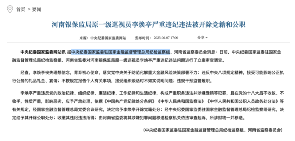 李焕亭的双开通报,是中央纪委国家监委驻国家金融监督管理总局纪检监察组和河南省监察委员会联合发布的。