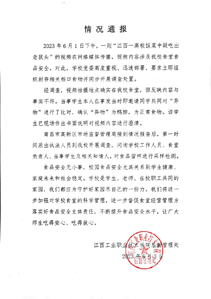 据此前报道,6月3日晚,江西工业职业技术学院官方微博发布情况通报,回应了此前引发争议的“学校食堂饭菜中吃出老鼠头”一事,称饭菜中的“异物”经当事人确认为鸭脖。