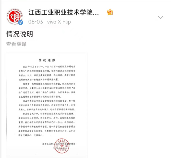6月17日,江西工职院“6·1”食品安全事件调查处理情况公布,江西工业职业技术学院官微已看不到此前声明。