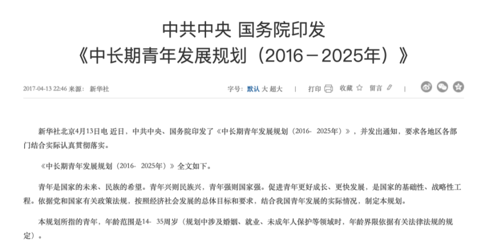 2017年4月,中共中央、国务院印发《中长期青年发展规划(2016-2025年)》。规划所指的青年,年龄范围是14-35周岁。