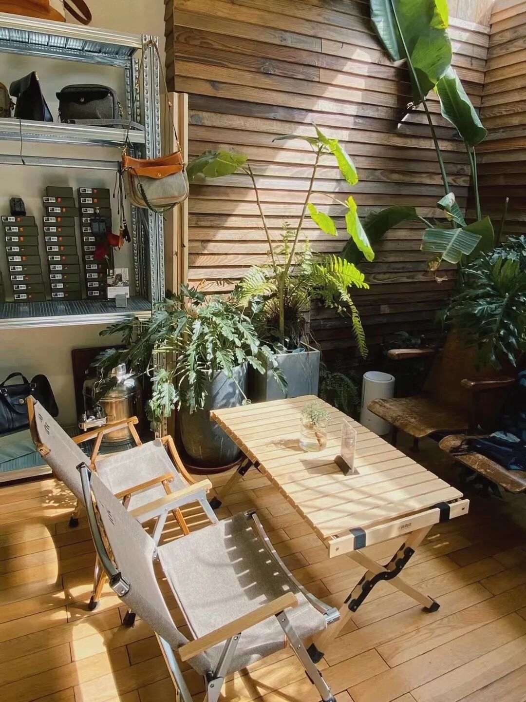 光影在枝桠间跳跃、脚踩碎石,背靠帐旁,享受午后时光,在这空间内很难不对户外自然产生向往。绿色二层阳光房,门口铺满了石子路,天幕、帐篷、露营桌椅一切就绪,露营风格拉满。店里随处可见各种绿植,高的、矮的、胖的、瘦的,有一种在城市里畅游热带雨林的既视感。