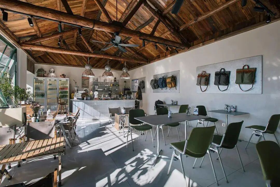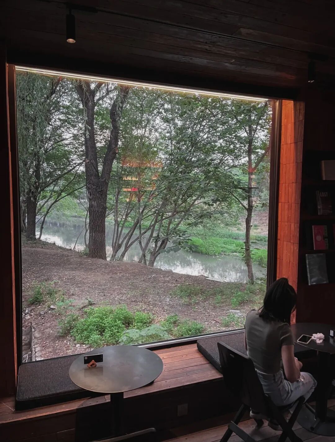 室内的空间并不大,挑高很高,于是被设计成了阶梯式的客座,每一块木板都来自于老船的甲板。红砖黑铁的建筑与自然相融,光线透过天井,把室内照得柔和舒适。最特别之处是,室内包围起一株高大的绿树,带着茂盛的枝叶和生命力从中穿出。最里侧的空间,大落地窗外也是将府公园的自然风光,小森林既视感,透过玻璃犹如在看巨幕电影一般。外摆区域是露营风,与自然环境融为一体,让人恍惚不在都市里。室外临着一条小河,夏季郁郁葱葱,让人心生欢喜。