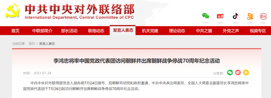 中共中央对外联络部发言人胡兆明7月24日宣布,应朝鲜劳动党和政府邀请,中共中央政治局委员、全国人大常委会副委员长李鸿忠将率中国党政代表团于7月26日起访问朝鲜并出席朝鲜战争停战70周年纪念活动。