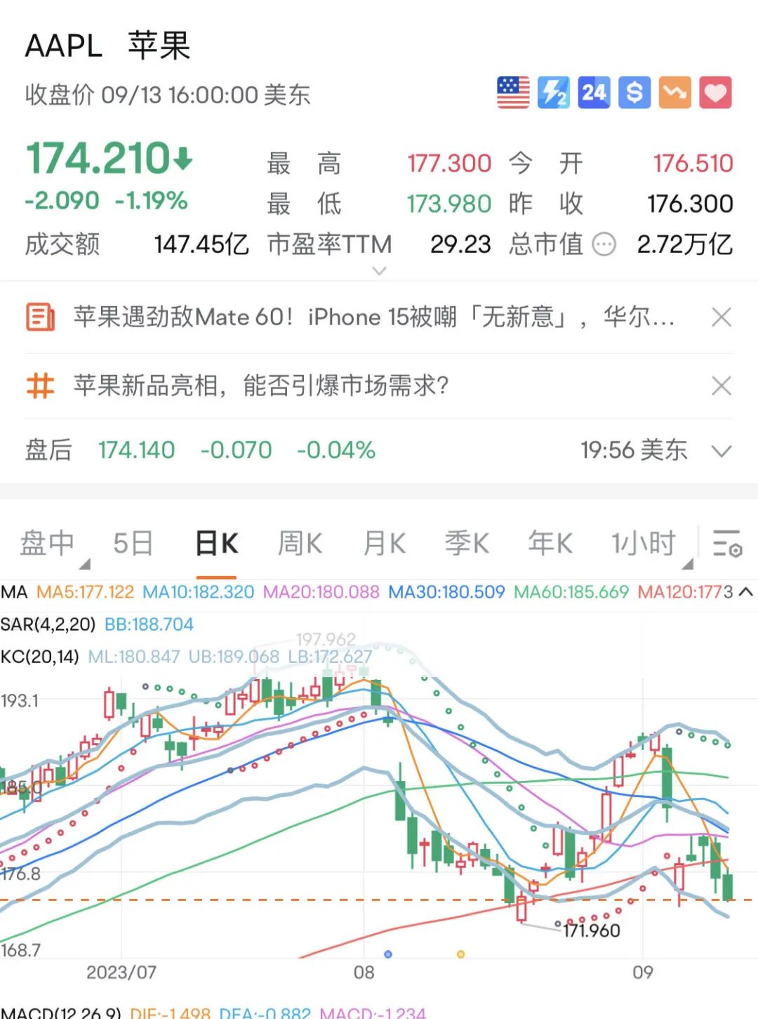 继9月12日下跌1.71%后,苹果在9月13日继续走跌,跌幅为1.19%,报收174.21美元/股,近两日市值蒸发超800亿美元(约合人民币5800亿元)。