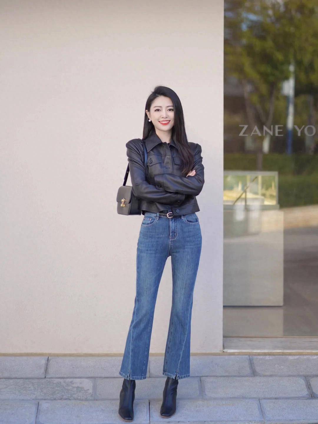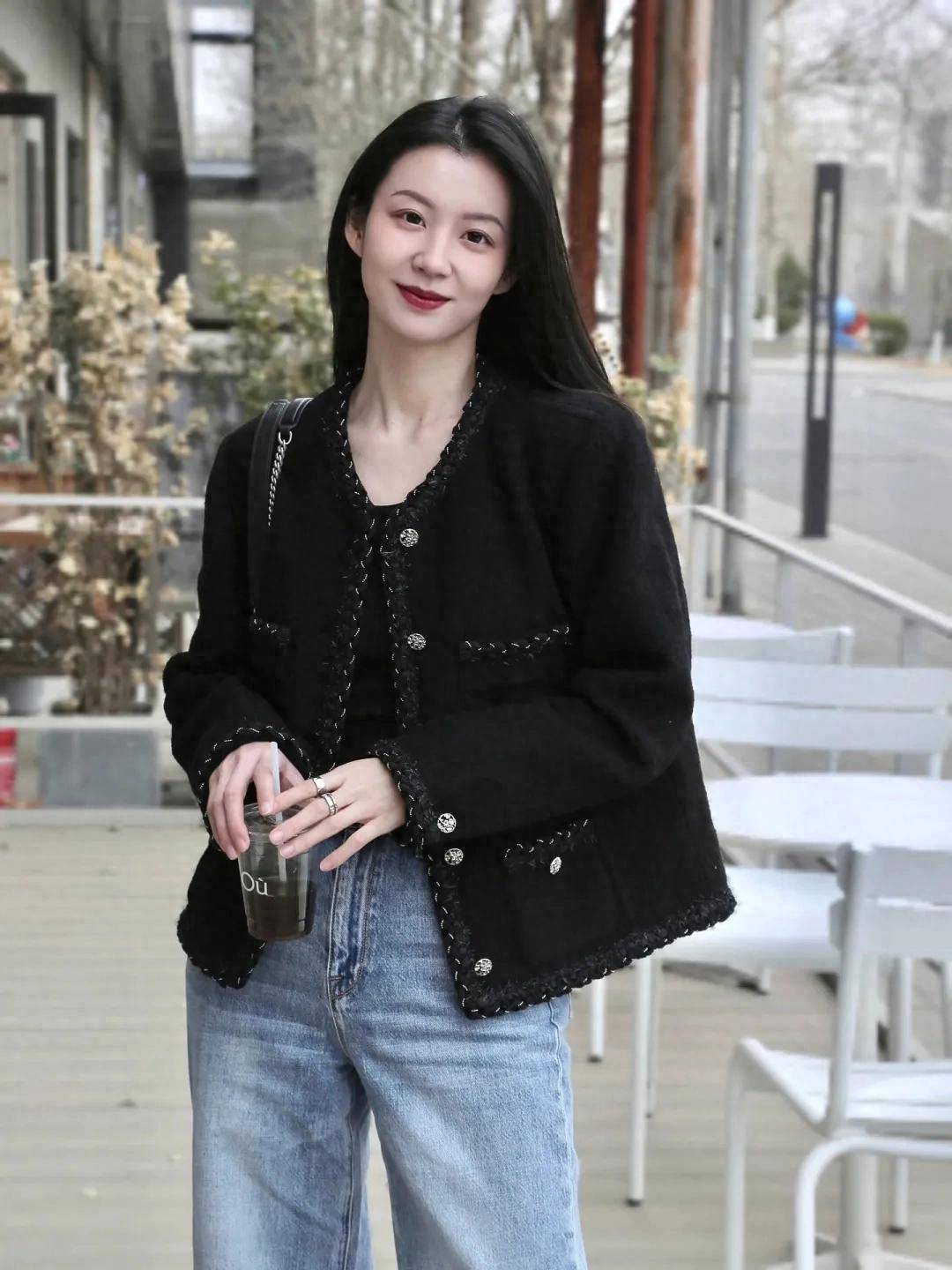 小香风外套也能穿出休闲风的既视感,下面这位博主的穿搭就告诉了我们答案,一件黑色小香风内搭黑色打底衫,和一条浅蓝色的牛仔裤,上身之后展现出你的气质,基础款和基础色的衣服单品降低出错率,太适合普通女生啦~