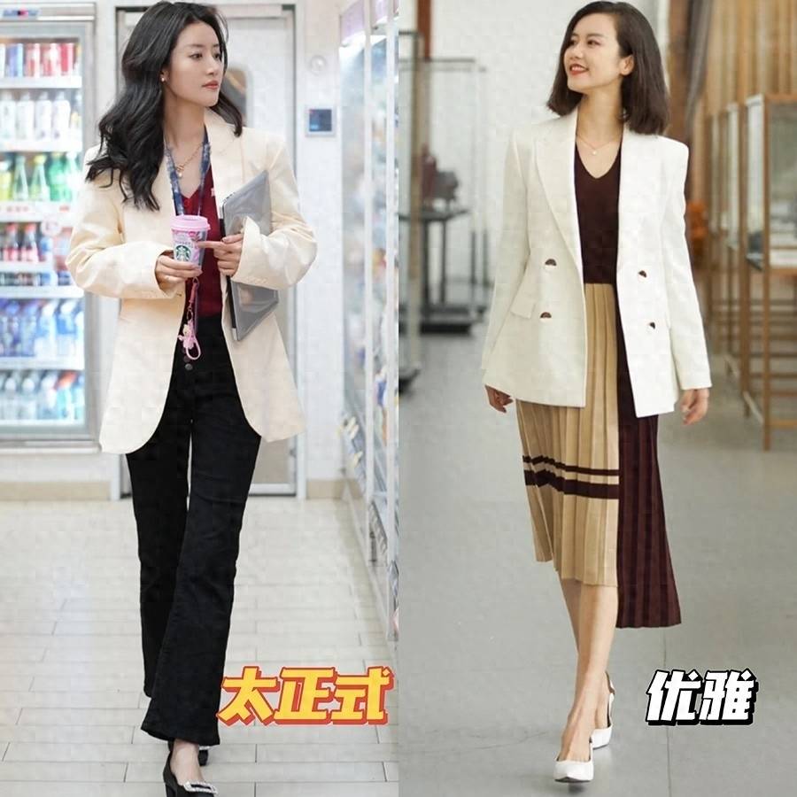即使是运用一些偏休闲感较为宽松,面料不是那么硬朗,挺阔的西装也会自然而然的呈现出一种干练利落的气质氛围。想要展现出你的女性魅力,可以用半身裙或者连衣裙作为内搭,这样的穿搭也是很多气质美女喜欢的搭配技巧之一。
