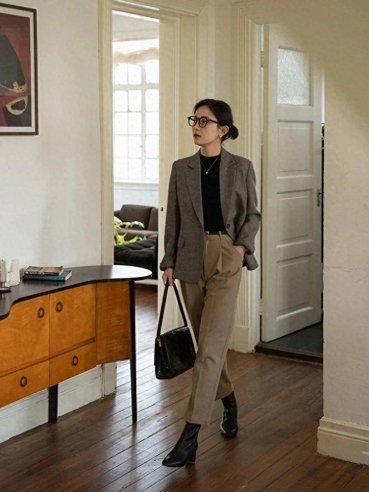 麻灰色的人字纹西装,既有着深色西装的稳重和内敛,但是又不会太过沉闷老气,运用这种高级的麻灰色确实是会让人眼前一亮,既端庄稳重又足够时髦大气