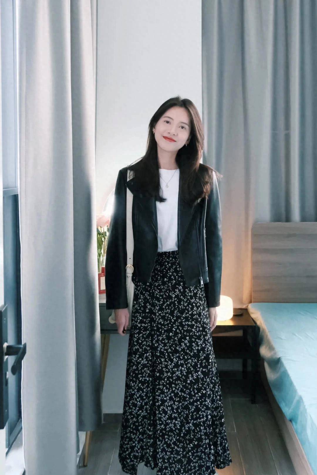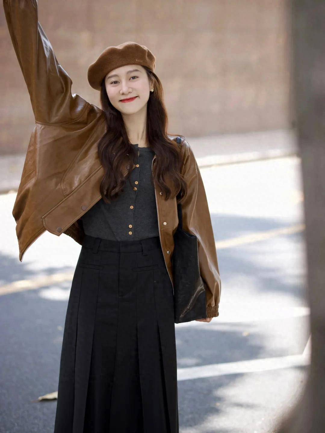 皮衣外套在这个秋季穿搭是一个非常不错的选择,想要成熟稳重的既视感可以选择黑色,想要俏皮洋气小香风,你可以选择大地色的皮衣外套,内搭一件灰色针织开衫,下半身选择一条压褶黑色半身裙,轻松展现出你的女性魅力,加上贝雷帽显得更加俏皮洋气。