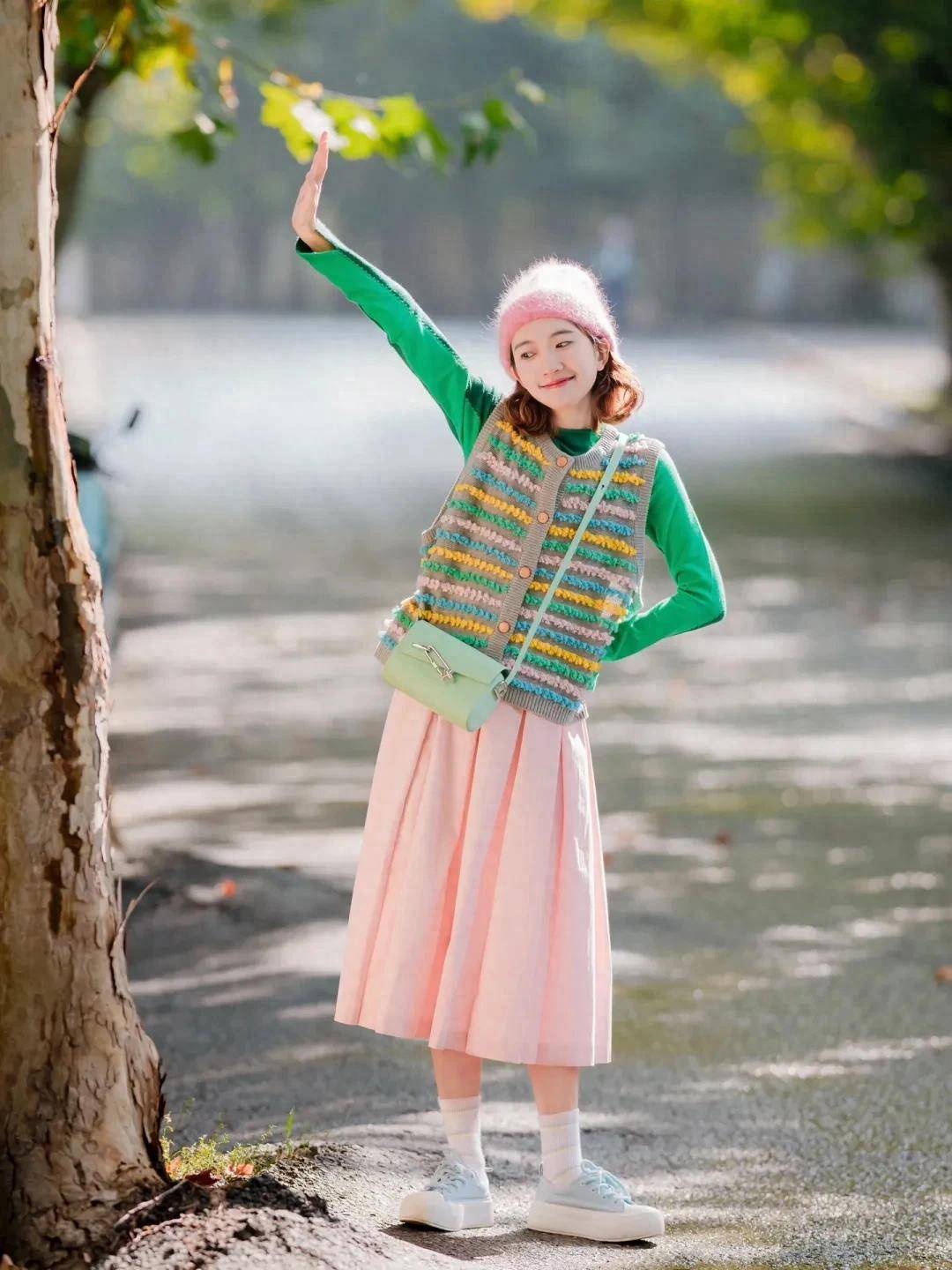 除了选择一些简约稳重的针织衫之外,我们还可以选择一些亮色彩色的针织衫,轻松营造出一种减龄俏皮的时尚感,例如这种绿色的针织衫颜色就非常的抢眼高调,再搭配绿色的条纹马甲,元气满满,活力十足,下半身竟然运用了粉色的A字裙来搭配,红配绿,但是却丝毫不觉得土气,反而透着满满的洋气感和温柔感,简单随性,活力十足。