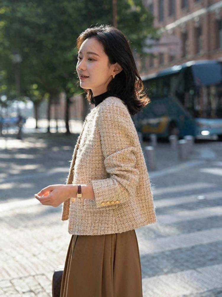 这件杏色的小香风外套整体版型设计就是非常简单的基础款设计,加上这种经典的粗花呢面料之后硬朗挺阔更好的修饰我们上半身的轮廓,显得精气神十足。