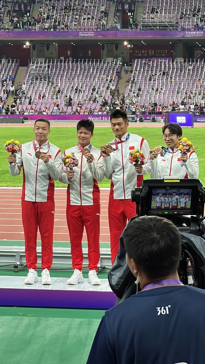 10月4日晚的杭州奥体中心体育场,见证了迟到的荣耀时刻。在当晚的田径比赛结束之后,举行了奥运奖牌递补颁发仪式,为伦敦奥运会女子20公里竞走选手切阳什姐、刘虹和吕秀芝递补颁发金银铜牌,为东京奥运会男子4×100米接力选手汤星强、谢震业、苏炳添、吴智强递补颁发奥运铜牌。