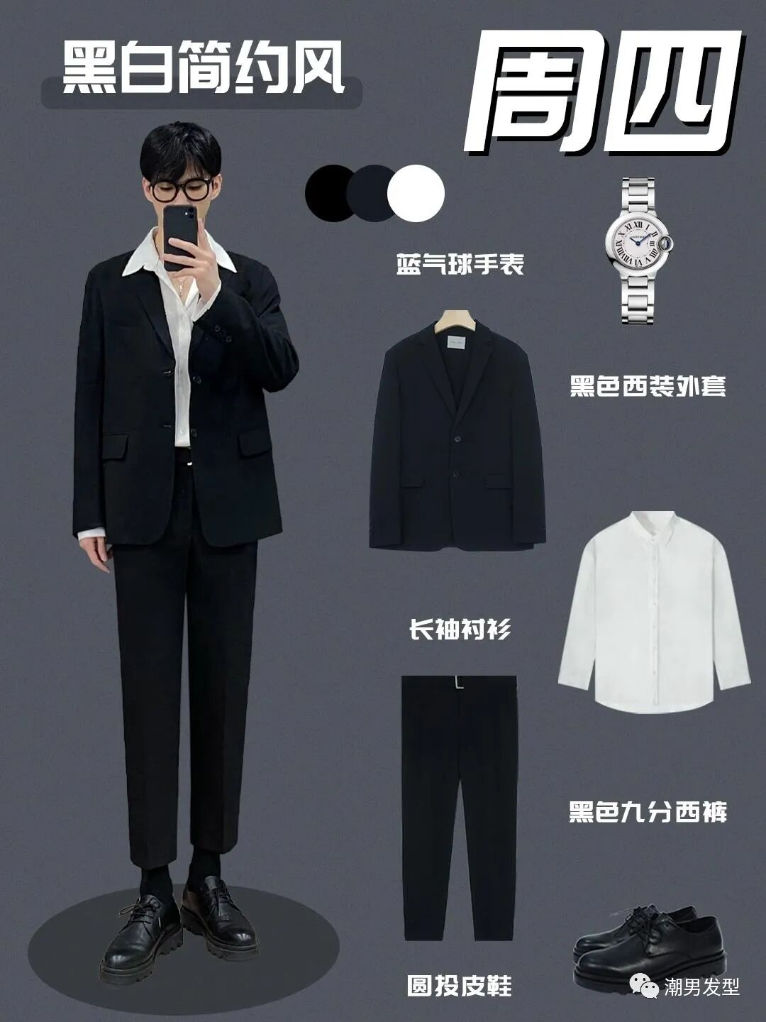 黑白配,是最经典的西装基础款。是西装新手的入门选择。
