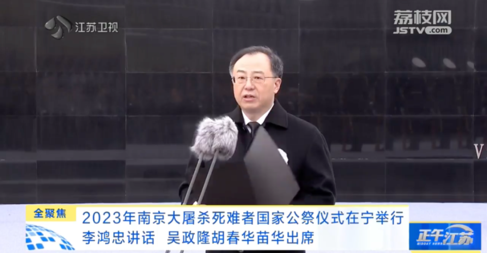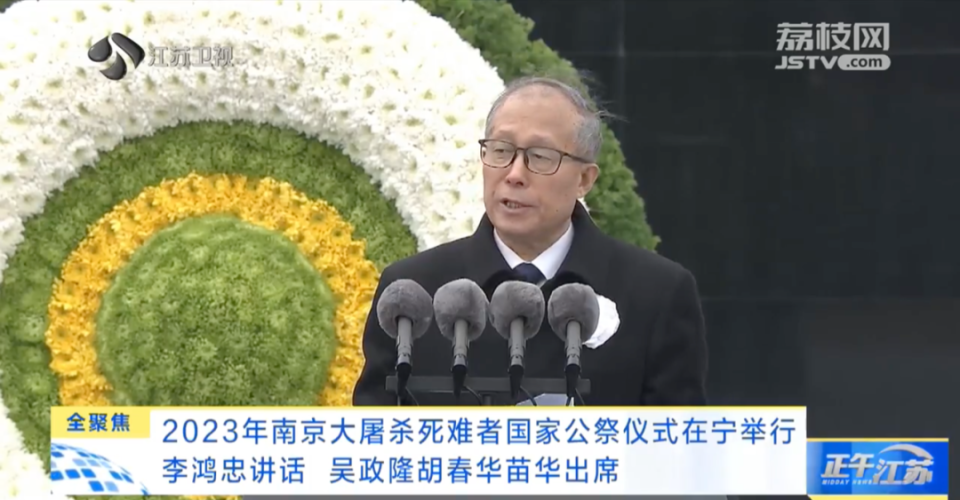 据新华社报道,出席2023年南京大屠杀死难者国家公祭仪式的是中共中央政治局委员、全国人大常委会副委员长李鸿忠。