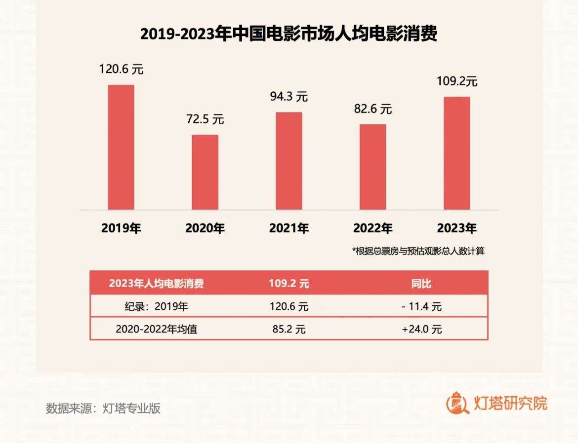 人均电影消费重新升至百元线以上。2023年全国放映规模超过2019年历史最高水平,场均人次近四年首度回升。全年平均票价维稳,热门档期片方下调发行结算价下限主动改变策略,2024元旦档影片集体下调发行结算价。根据观影总人数预估,中国电影市场人均电影消费回升至109元。