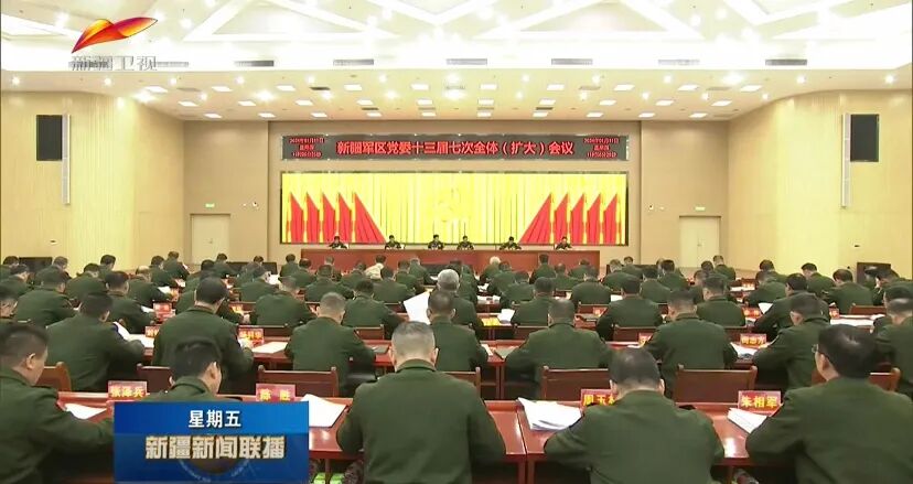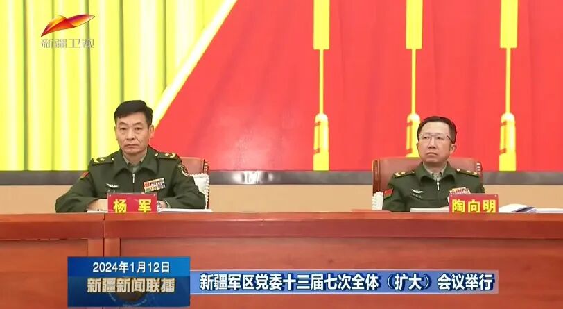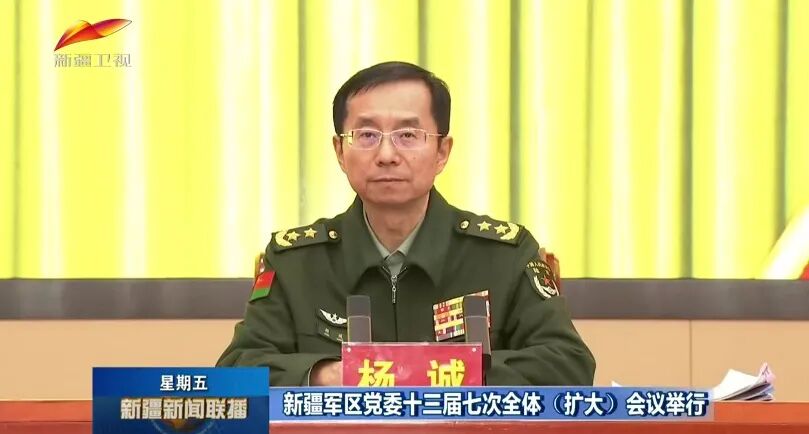 《新疆新闻联播》画面显示,新疆军区党委书记、政委杨诚代表军区党委常委会作报告。新疆军区党委副书记、司令员柳林讲话。
