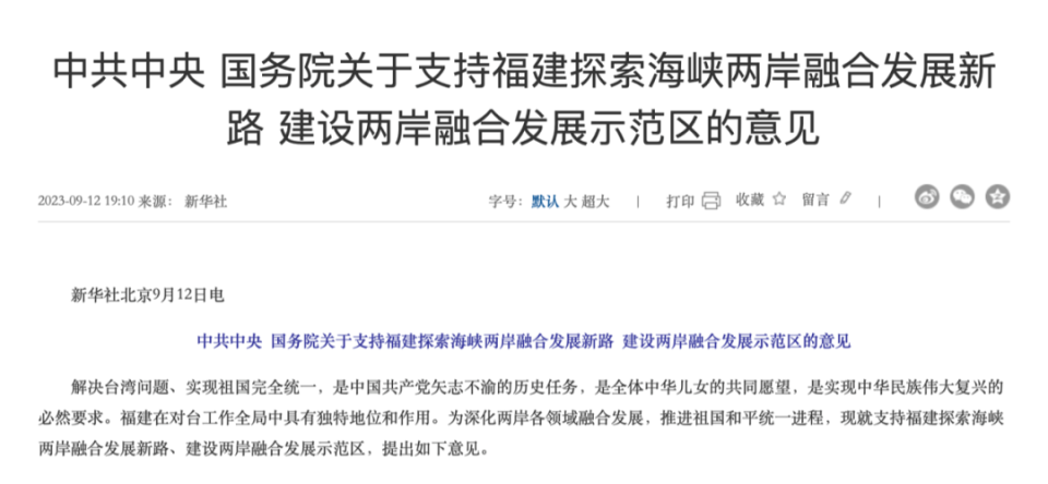 就在去年9月,中共中央、国务院出台了《关于支持福建探索海峡两岸融合发展新路建设两岸融合发展示范区的意见》。