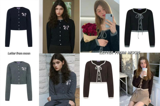 另一个韩国品牌Letter form moon的少女系穿搭更偏向于学院风,蝴蝶结针织开衫乖巧学院风,也是许多女爱豆私服常见款式,整体充满松弛感,剪裁简洁大方,蝴蝶结更是衣服的亮点设计,款式虽然简洁,也具有少女感的甜美。
