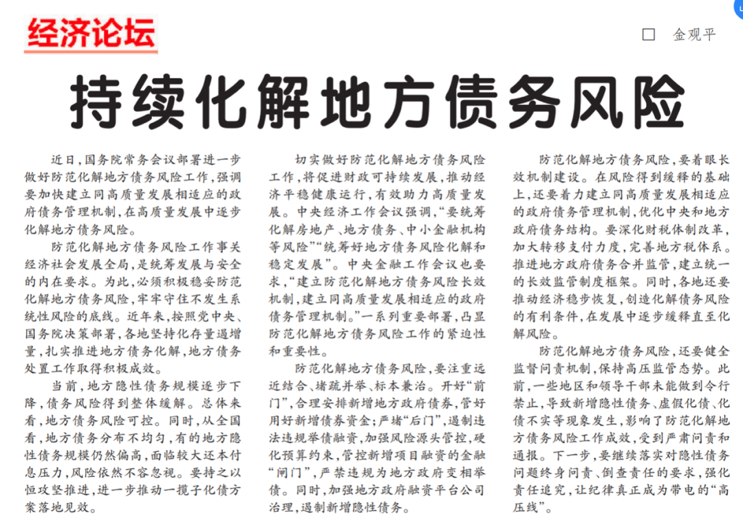 《经济日报》在《持续化解地方债务风险》一文中提到: