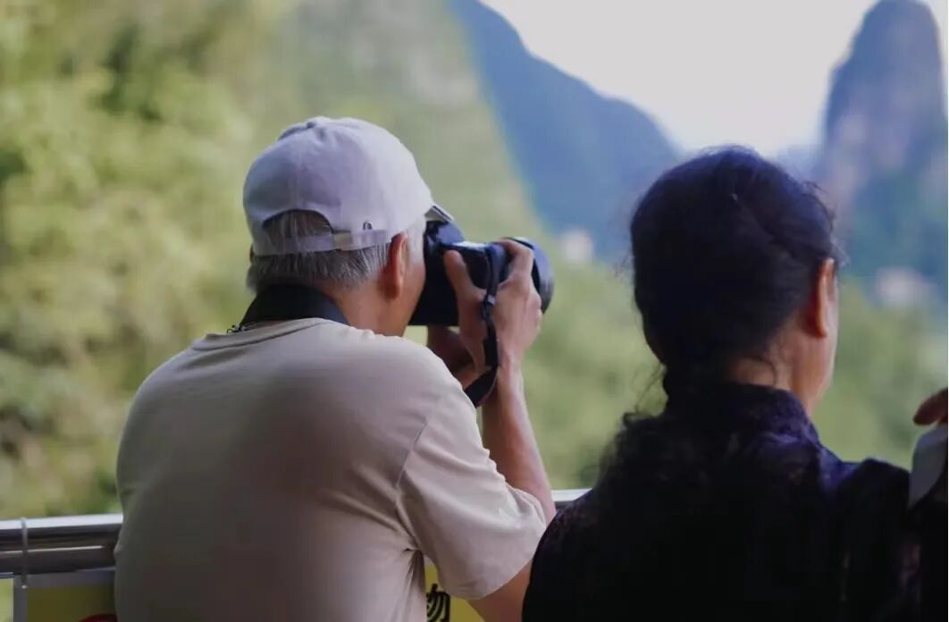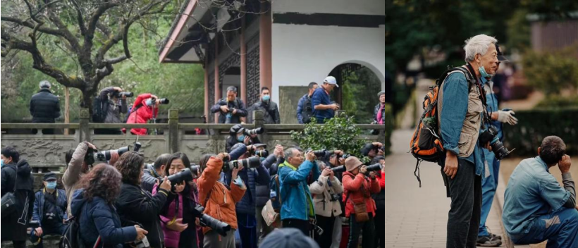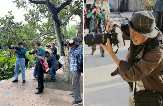 除了大妈们的闺蜜档旅游,公园角落的大爷队伍也出奇地默契。冲锋衣、大挎包、工装马甲、大长焦镜头,公园里的大爷们穿搭具有实用性,仿佛口袋里能翻出任何他们想要的东西。