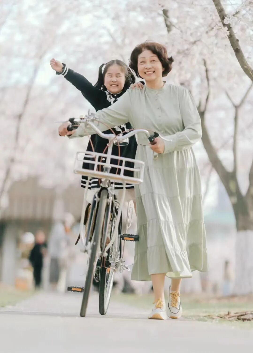 春天到了,怎么能不拍樱花呢?樱花色淡,要想与景色更好融合,可以学习大妈穿一身素色连衣裙,找一些道具让拍照场景更加自然,笑容也会愈发放松,从而有了这样一幅美妙的画卷。