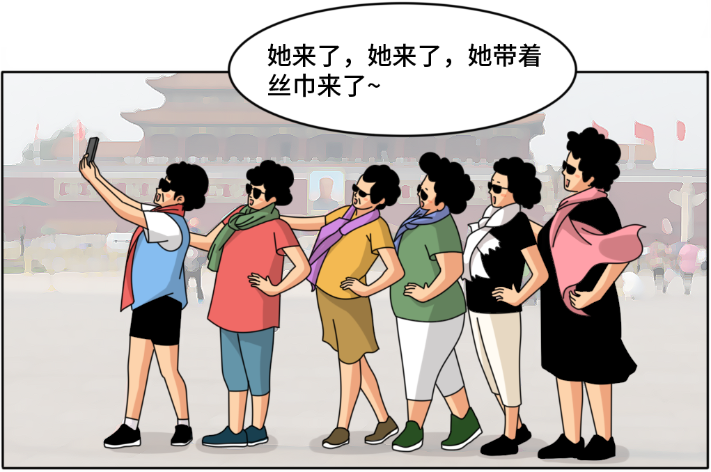 大妈们的另一种防伪标识恰好与她们简约的穿搭相反——彩色的丝巾,时尚的大妈们会在脖子上系一块大丝巾,在素雅简约的穿搭中起到点睛作用,也是拍照出片神器。