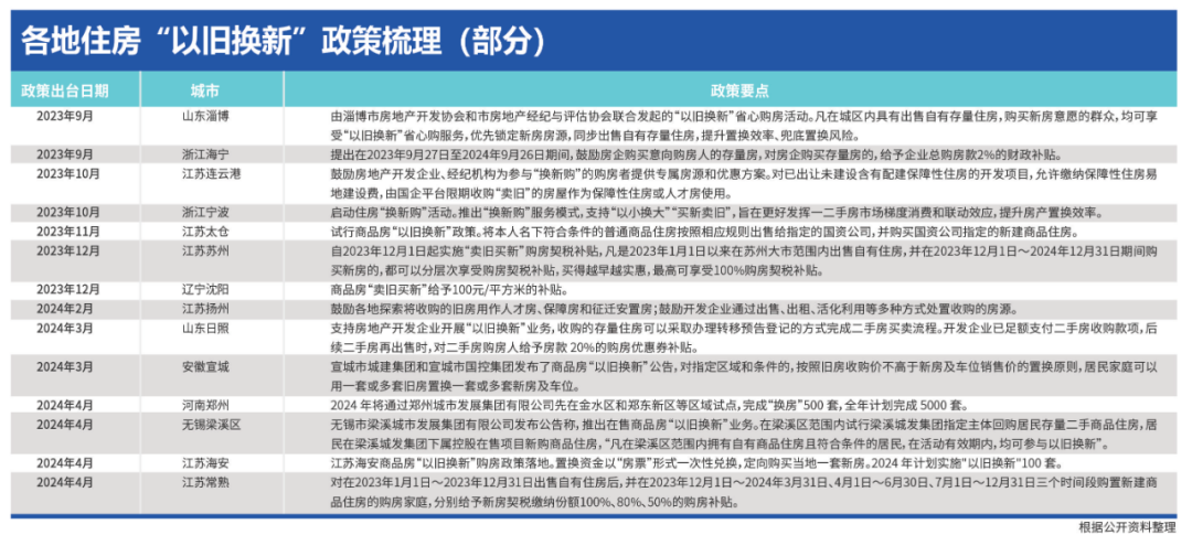 4月1日,郑州市住房保障和房地产管理局等六部门联合印发《郑州市促进房产市场“卖旧买新、以旧换新”工作方案(试行)》,计划2024年完成二手住房“卖旧买新、以旧换新”1万套,其中政府收储5000套。紧随其后,无锡梁溪区、江苏海安、江苏常熟等城市也相继推出商品房“以旧换新”政策。据机构统计,自2023年以来,已经有超过30个城市明确表态支持住房以旧换新,通过采取国企下场直接收购、委托经纪机构出售旧房、减免契税或财政补贴等方式,助推新建商品房和二手住房市场成交。