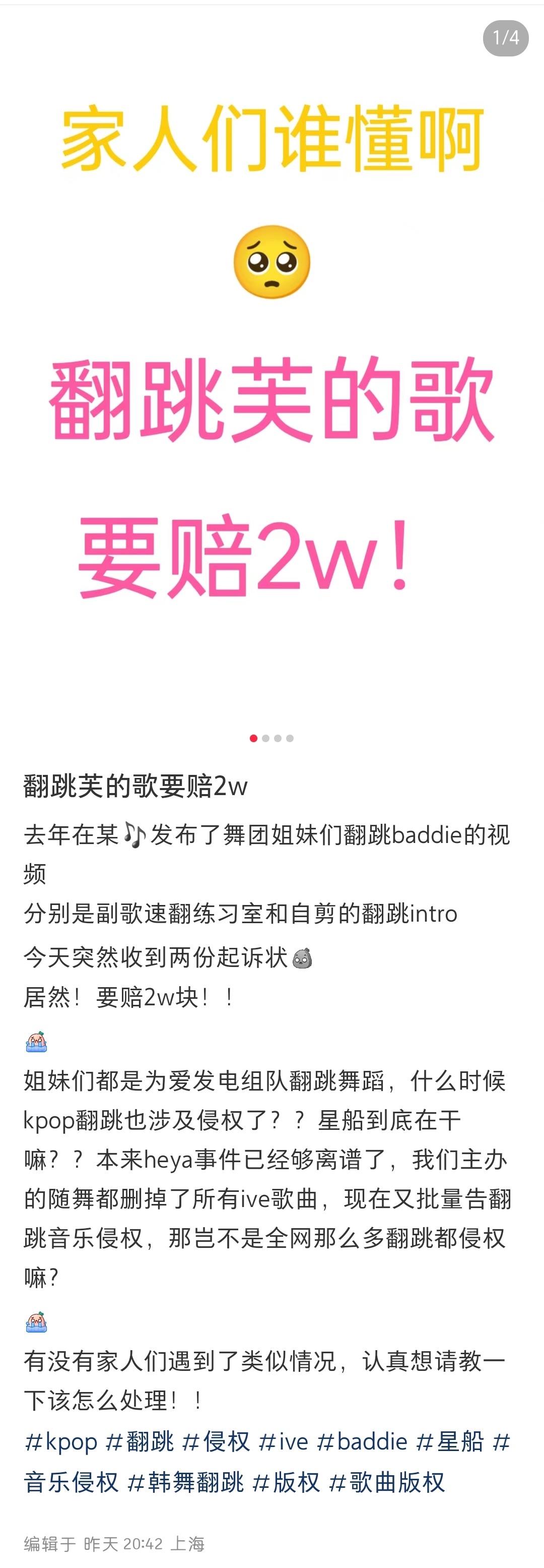 5月22日,上海一舞蹈工作室在小红书发文称自己去年在短视频平台发布了韩国女子偶像团体IVE新歌《baddie》翻跳的视频。22日工作室突然收到了起诉状要求索赔两万元,工作室工作人员向网友求助“什么时候kpop翻跳也涉及侵权了?岂不是全网那么多翻跳都侵权嘛?”