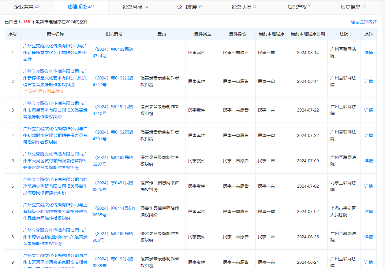 韩国女团IVE所属公司为星船娱乐,广州立梵醍文化传播有限公司为星船娱乐的授权公司。天眼查App显示,广州立梵醍文化传播有限公司成立于2014年1月,注册资本100万人民币,法定代表人为何伟祥,由何伟祥、何爱兰共同持股。根据该公司的案件分析数据显示,截止今日该公司在2024年已有168个正在审理中的案件,68.0%的涉案案由为侵害录音录像制作者权纠纷,98.8%的案件身份为原告,当前有166个案件处于民事一审阶段,最新开庭日期已排到8月14日。