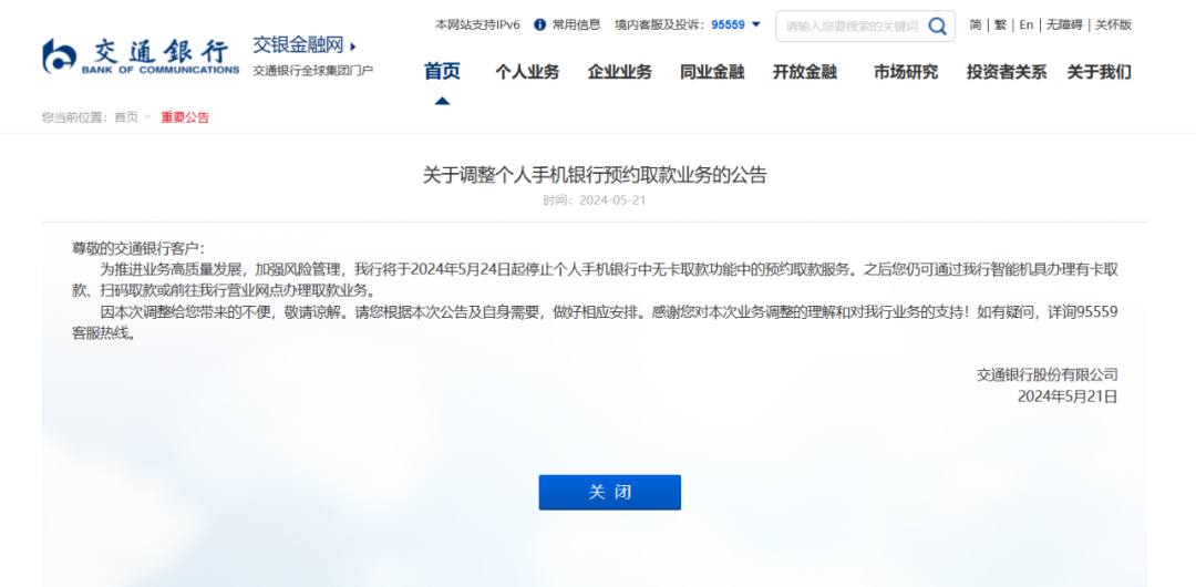 日前,交通银行发布公告称,为推进业务高质量发展,加强风险管理,该行将于2024年5月24日起停止个人手机银行中无卡取款功能中的预约取款服务。之后客户仍可通过交通银行智能机具办理有卡取款、扫码取款或前往银行营业网点办理取款业务。
