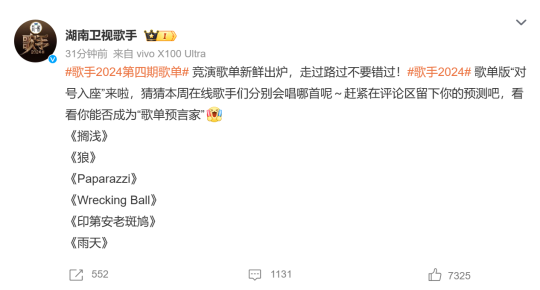 29日,《歌手2024》第四期竞演歌单新鲜出炉,分别为《搁浅》《狼》《Paparazzi》《Wrecking Ball》《印第安老斑鸠》《雨天》。其中《搁浅》《印第安老斑鸠》两首都是周杰伦的歌。